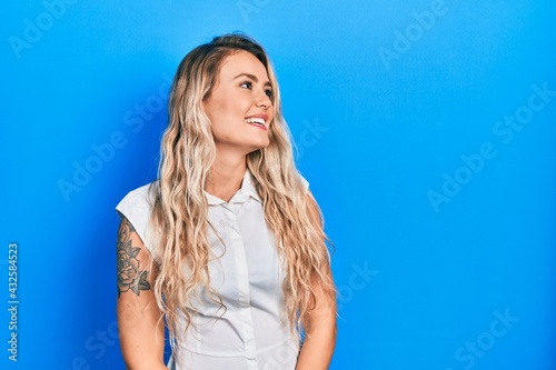 Beautiful young blonde woman wearing casual white shirt looking away to side with smile on face, natural expression. laughing confident.