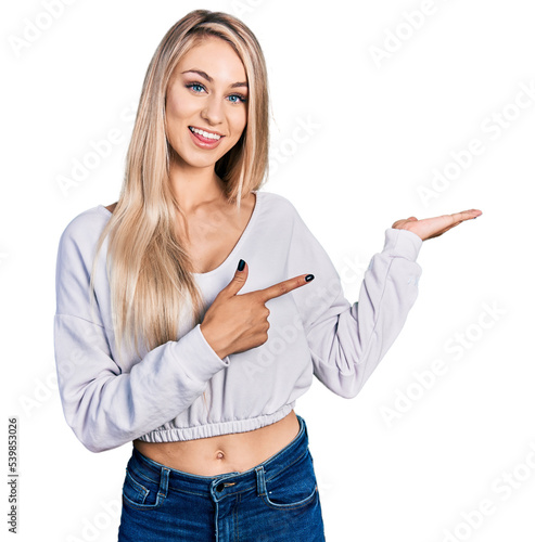 Beautiful young blonde woman wearing casual white sweater amazed and smiling to the camera while presenting with hand and pointing with finger.