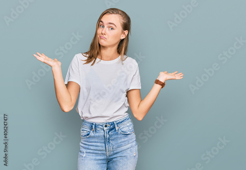 Beautiful young blonde woman wearing casual white t shirt clueless and confused expression with arms and hands raised. doubt concept.