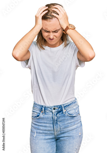 Beautiful young blonde woman wearing casual white t shirt suffering from headache desperate and stressed because pain and migraine. hands on head.
