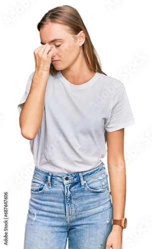 Beautiful young blonde woman wearing casual white t shirt tired rubbing nose and eyes feeling fatigue and headache. stress and frustration concept.