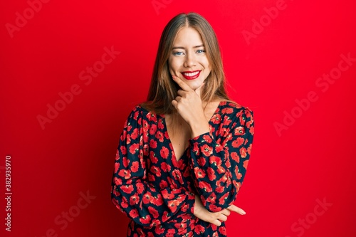 Beautiful young blonde woman wearing elegant dress looking confident at the camera smiling with crossed arms and hand raised on chin. thinking positive.