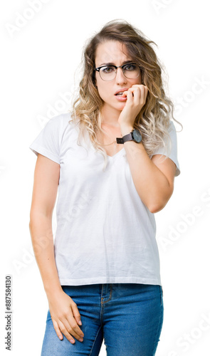 Beautiful young blonde woman wearing glasses over isolated background looking stressed and nervous with hands on mouth biting nails. Anxiety problem.