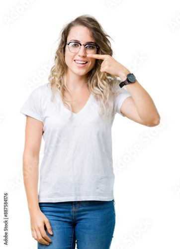Beautiful young blonde woman wearing glasses over isolated background Pointing with hand finger to face and nose, smiling cheerful