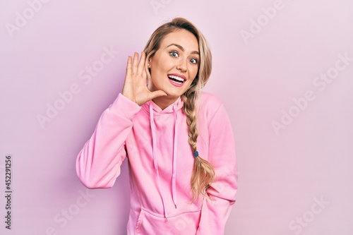 Beautiful young blonde woman wearing pink sweatshirt smiling with hand over ear listening and hearing to rumor or gossip. deafness concept.