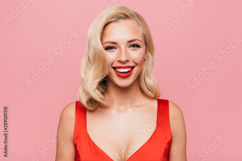 Beautiful young blonde woman wearing red dress standing
