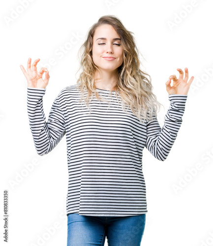 Beautiful young blonde woman wearing stripes sweater over isolated background relax and smiling with eyes closed doing meditation gesture with fingers. Yoga concept.
