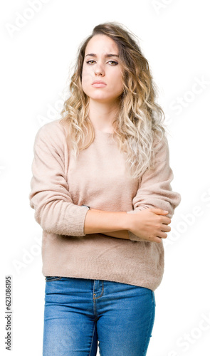 Beautiful young blonde woman wearing sweatershirt over isolated background skeptic and nervous, disapproving expression on face with crossed arms. Negative person.