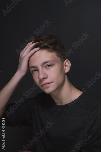 Beautiful young brown-haired man in a gray jacket, expressive and sensual portraits of a young man