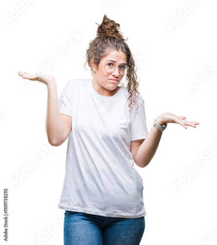 Beautiful young brunette curly hair girl wearing glasses over isolated background clueless and confused expression with arms and hands raised. Doubt concept.