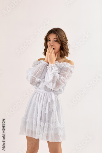 beautiful young brunette woman in white dress