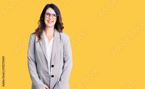 Beautiful young brunette woman wearing business clothes and glasses looking positive and happy standing and smiling with a confident smile showing teeth