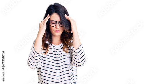 Beautiful young brunette woman wearing casual clothes and glasses with hand on head for pain in head because stress. suffering migraine.