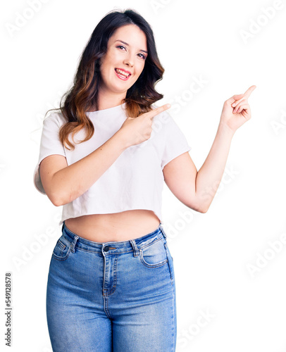 Beautiful young brunette woman wearing casual clothes smiling and looking at the camera pointing with two hands and fingers to the side.