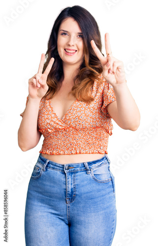 Beautiful young brunette woman wearing casual clothes smiling looking to the camera showing fingers doing victory sign. number two.