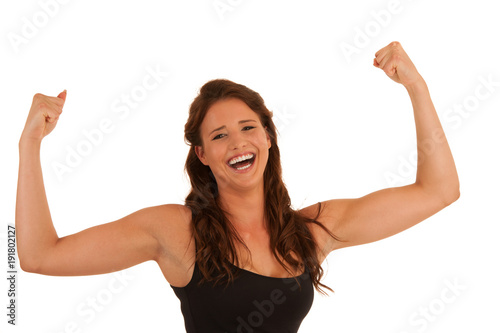 beautiful young business woman gesturing success with arms up in the air isolated over white background