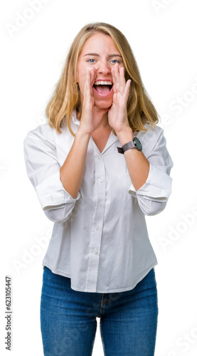 Beautiful young business woman over isolated background Shouting angry out loud with hands over mouth