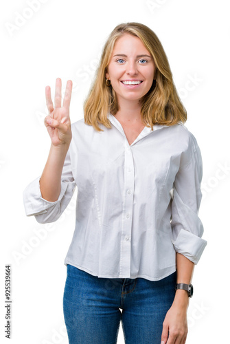 Beautiful young business woman over isolated background showing and pointing up with fingers number three while smiling confident and happy.