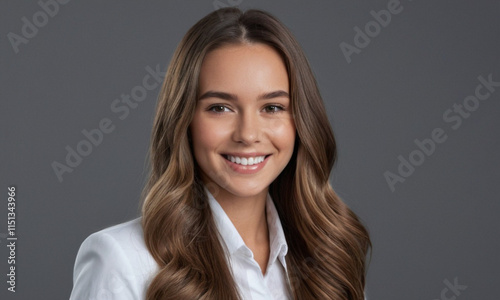 Beautiful young business woman portrait, Smiling cute girl with long hair studio shot, Isolated on gray background