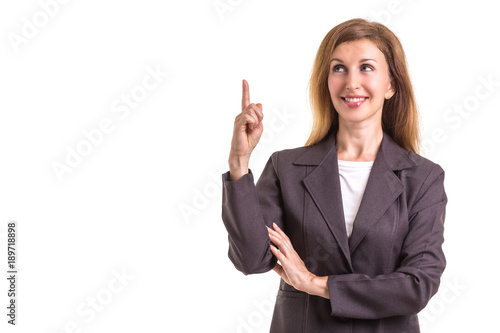 Beautiful young caucasian businesswoman in grey suit with hand gesture isolated on white