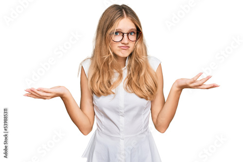 Beautiful young caucasian girl wearing casual clothes and glasses clueless and confused expression with arms and hands raised. doubt concept.