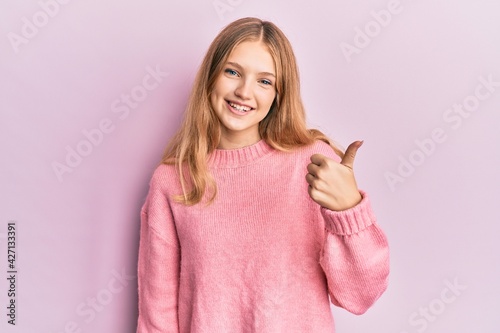 Beautiful young caucasian girl wearing casual clothes doing happy thumbs up gesture with hand. approving expression looking at the camera showing success.