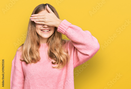 Beautiful young caucasian girl wearing casual winter sweater smiling and laughing with hand on face covering eyes for surprise. blind concept.