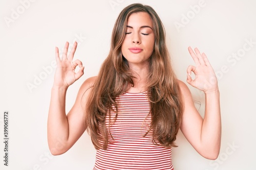 Beautiful young caucasian woman wearing casual clothes relax and smiling with eyes closed doing meditation gesture with fingers. yoga concept.
