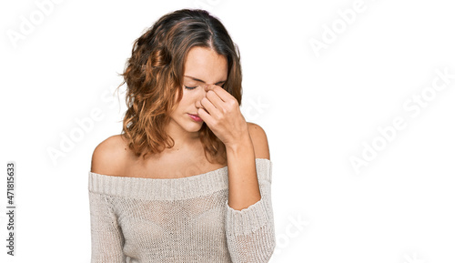 Beautiful young caucasian woman wearing casual clothes tired rubbing nose and eyes feeling fatigue and headache. stress and frustration concept.