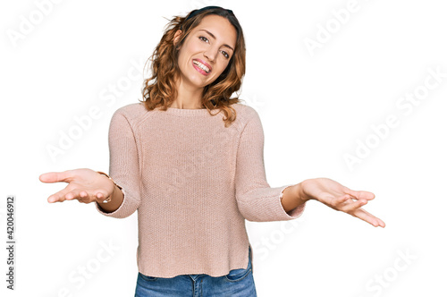 Beautiful young caucasian woman wearing casual sweater smiling cheerful offering hands giving assistance and acceptance.