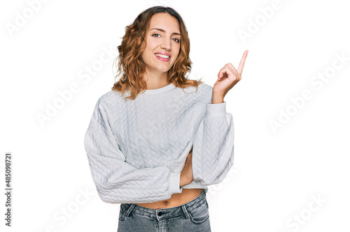 Beautiful young caucasian woman wearing casual winter sweater with a big smile on face, pointing with hand and finger to the side looking at the camera.