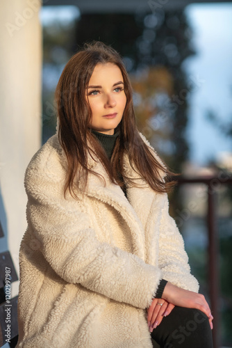 Beautiful young dark-haired girl in an urban environment in early spring.