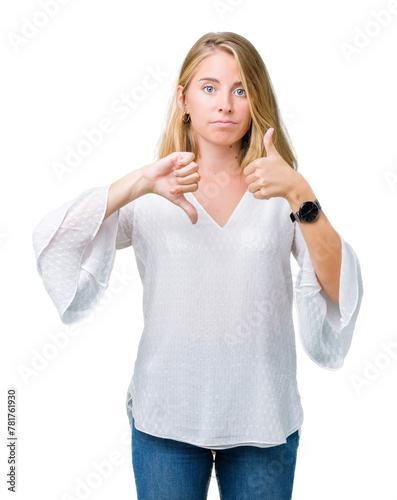 Beautiful young elegant woman over isolated background Doing thumbs up and down, disagreement and agreement expression. Crazy conflict