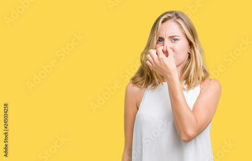 Beautiful young elegant woman over isolated background smelling something stinky and disgusting, intolerable smell, holding breath with fingers on nose. Bad smells concept.