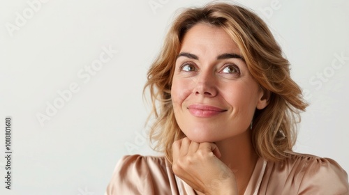 Beautiful young European woman of middle age smiles gently keeps hand under chin looks away with dreamy expression wears silk blouse isolated over white background copy space for advertisement