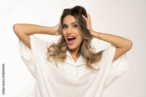 beautiful young excited happy women with makeup and long wavy hair on a white background.