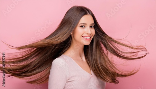 Beautiful Young Female Model Shaking Her Gorgeous Hair in Motion, Isolated on Pastel Color Background