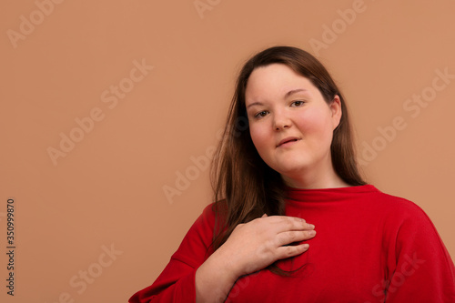 Beautiful young girl in a bright red jacket, overweight girl.