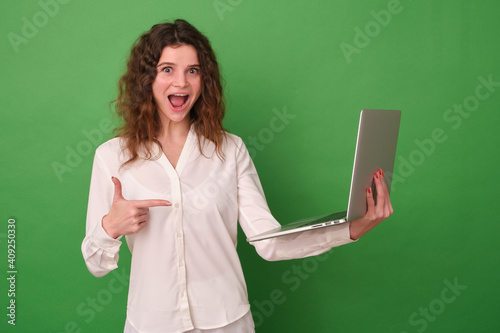 Beautiful young girl in a white shirt on a green background. A girl with a happy face holds a laptop in her hand and shows excellent with the other hand