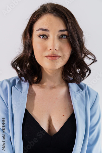 Beautiful young girl in black trousers and a blue jacket on a white background. Portrait of a beautiful young woman