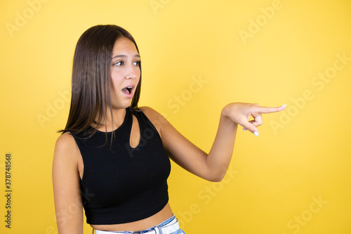 Beautiful young girl kid over isolated yellow background pointing with finger surprised ahead, open mouth amazed expression, something on the front