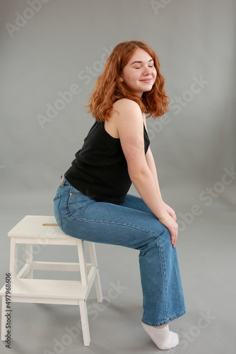 beautiful young girl model redhead. model in jeans and black top on a gray background. studio shooting. model with red hair and unusual appearance.