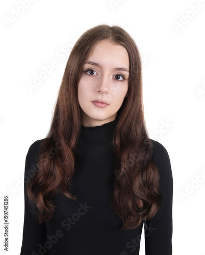 Beautiful young girl portrait isolated on white background. Attractive woman formal style.Long hair lady.Brunette.Student.