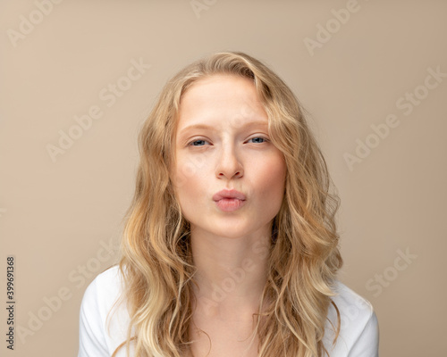 Beautiful young girl showing lips for kissing. Pretty blonde with curly hair in white t shirt against beige wall looking at camera. Natural beauty without makeup