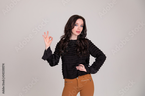 Beautiful young girl smiles and showing the sign of approval. gray background. Copy space