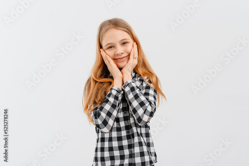 Beautiful young girl with blonde hair smiles at camera, posing, touching face with her hands, wears casual shirt. Teen girl looking happy and delighted. Indoor studio shot on white background