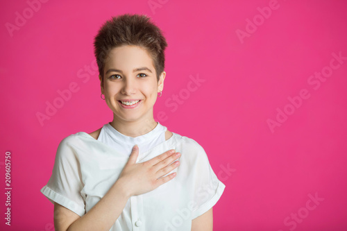 beautiful young girl with short hairdo in a white t-shirt on a pink background