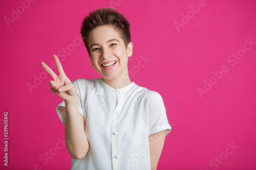 beautiful young girl with short hairdo in a white t-shirt on a pink background