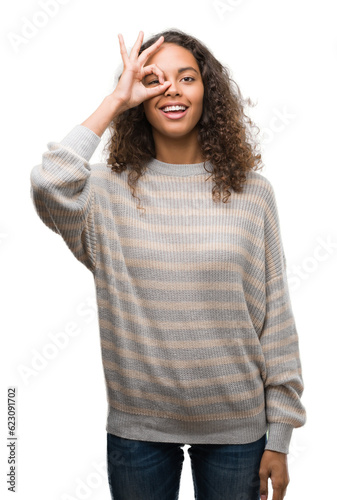 Beautiful young hispanic woman wearing stripes sweater doing ok gesture with hand smiling, eye looking through fingers with happy face.