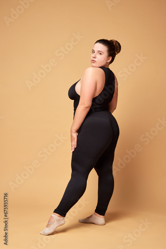 Beautiful young overweight woman in black sportswear standing against beige studio background. Concept of sport, body-positivity, weight loss, body and health care. Copy space for ad